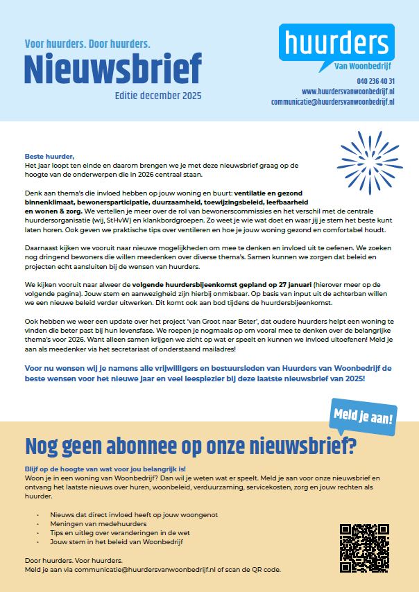 De afgelopen periode stonden betaalbaarheid, doorstroming en communicatie centraal. In dit nummer lees je onder meer het verhaal van Yvonne en Fred, die al ruim 30 jaar in hun woning wonen en hun ervaringen deelden tijdens de laatste huurdersbijeenkomst. Hun signalen over communicatie en bewonerscommissies zijn herkenbaar voor veel huurders, en daarom zo belangrijk om samen te bespreken.